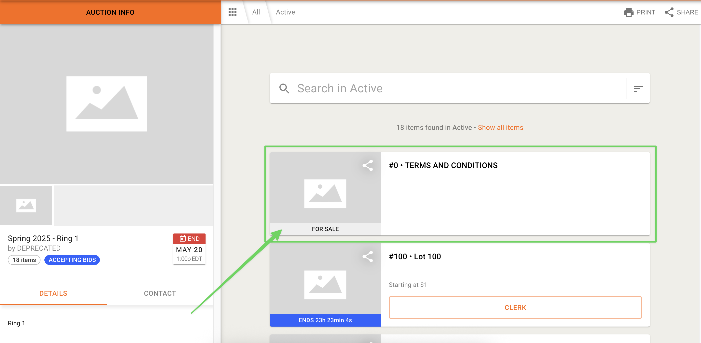 Some auction companies like to have an informational lot {also referred to as an "info lot"} as part of each auction. In general, this lot or lots live at the beginning of the auction, but some company may disperse them throughout a catalog. The lot contains important bidder-specific information such as pickup time, buyer's premium, contact information, or any other info that you'd like to remind buyers of.