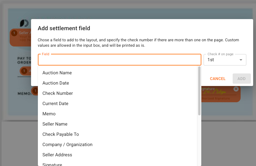 Next, click "Add Settlement Field" to begin adding where the settlement-generated fields will print on your checks: