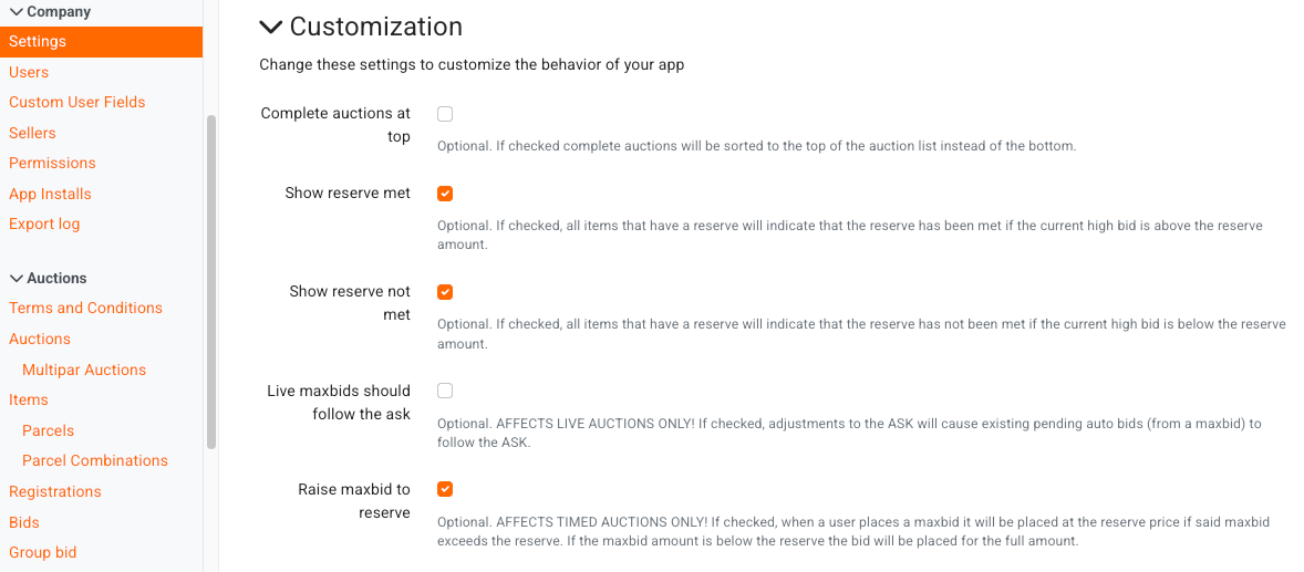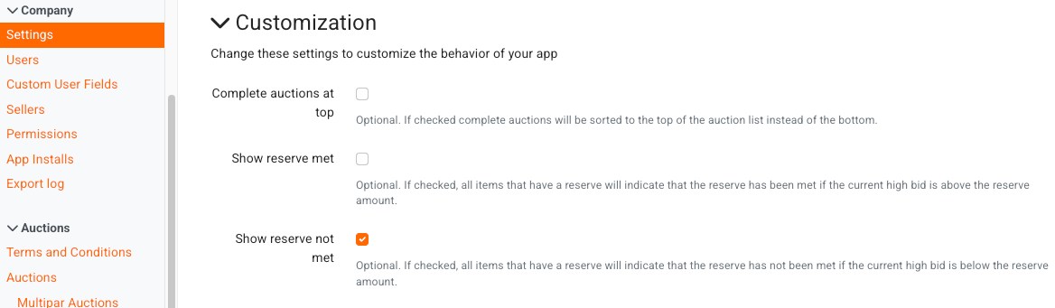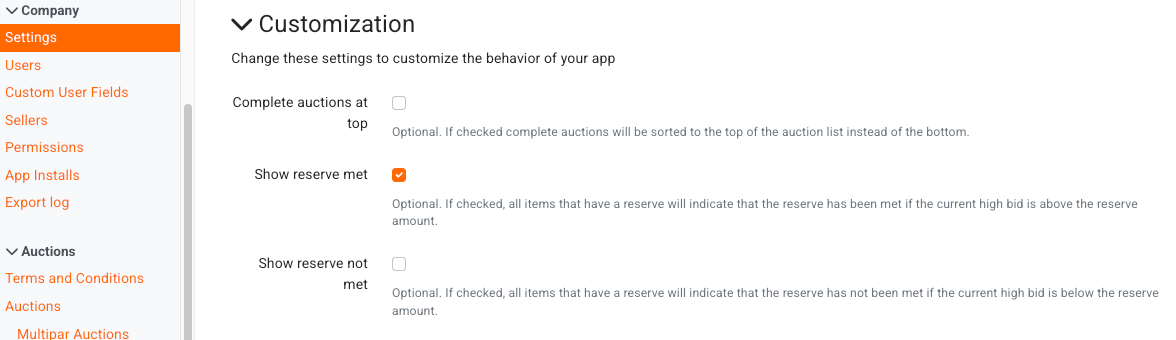 If you want bidders to be able to see that a reserve has been met on an item, you can choose to enable "Show Reserve Met." In order to do this, Click on "Settings" and Scroll to the "Customization" section. Check the box marked "Show Reserve Met" and click on save.