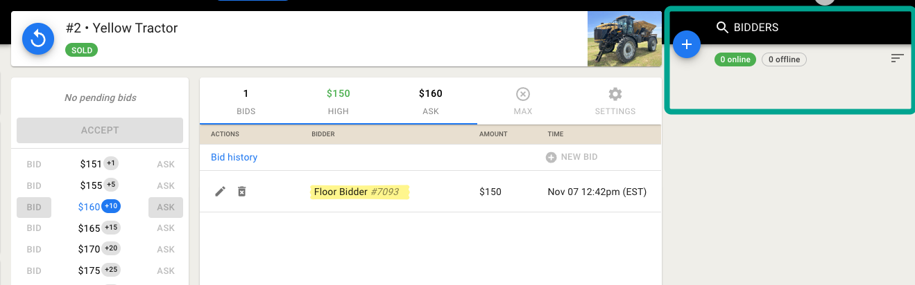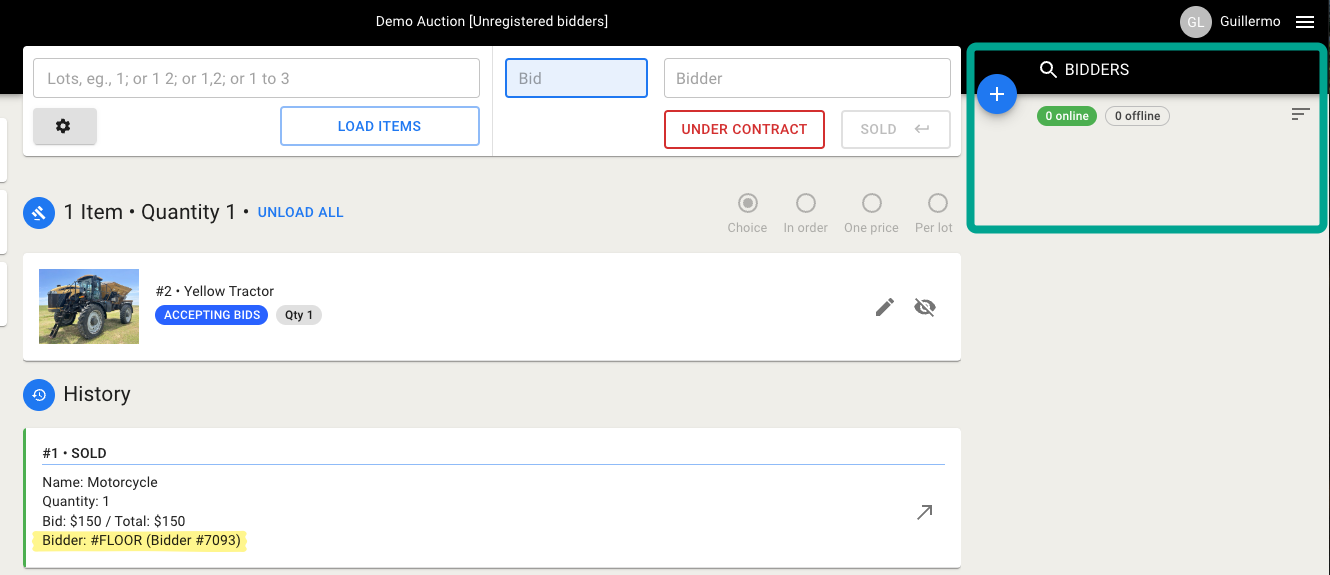 If a bidder hasn’t been registered and their paddle number is entered in the system to sell an item (e.g. #7093), it will be sold to a floor bidder.