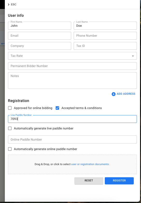 Then click "New Registration" to enter the bidder's information and paddle number.