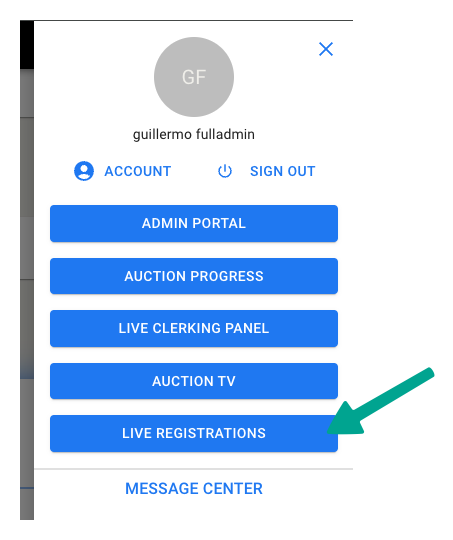 First, navigate to the Live Registrations Panel (located under the hamburger menu). Please note that this option is only available for live auctions.