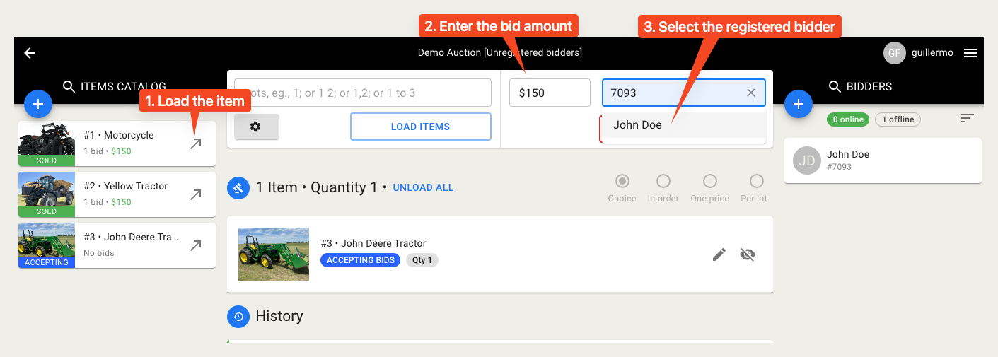 The same applies when we clerk to the paddle number of an unregistered bidder in the online clerking panel.