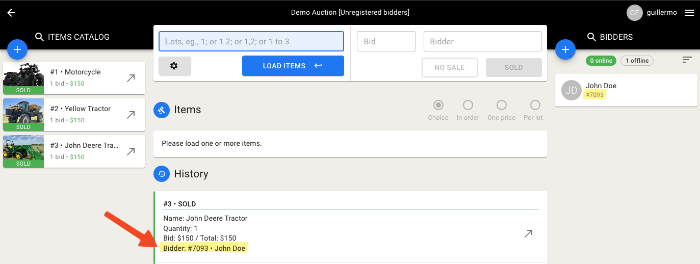 In this article, we'll demonstrate what it looks like when we clerk to an unregistered bidder both on the online clerk and live clerk screens. We'll show you how to fix this by registering the bidder and re-clerking the item.
