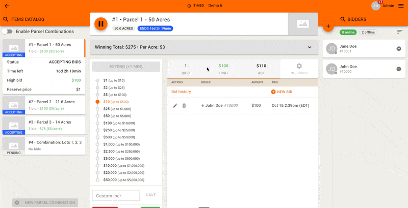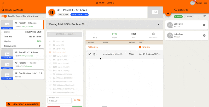 Enable Parcel Combinations | Can be toggled here once all individual parcels have a high bid. |