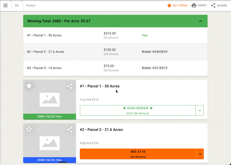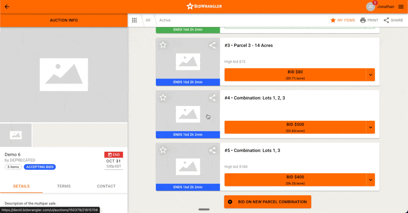 Once enabled, bidders can bid on pre-set combinations and, by default, create their own combinations with an accompanying bid as long as bidder combination creation isn't disabled via the auction settings. If the parcels chosen and bid on already exist, the bid will be placed on that pre-existing combination. Here is an example of what that bidder experience looks like: