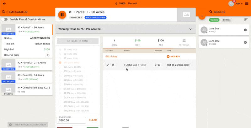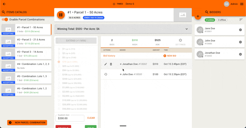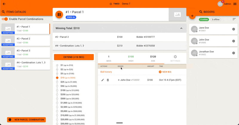 Multi-Par live auctions must be operated from the Online Clerking Panel; the Live Clerking Panel is not available for this format. A clerk accepts/logs bids to bidder on Parcels and Parcel Combinations one-at-a-time in rounds, moving from one active parcel to the next when no more bids are made. The Ask amount on all applicable parcels and combinations updates for every bid.