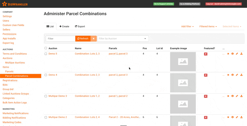 Parcel Combinations Enabled? This setting will not be available to enable when initially creating the auction. It can be enabled for any created combinations only after each parcel has received a bid.