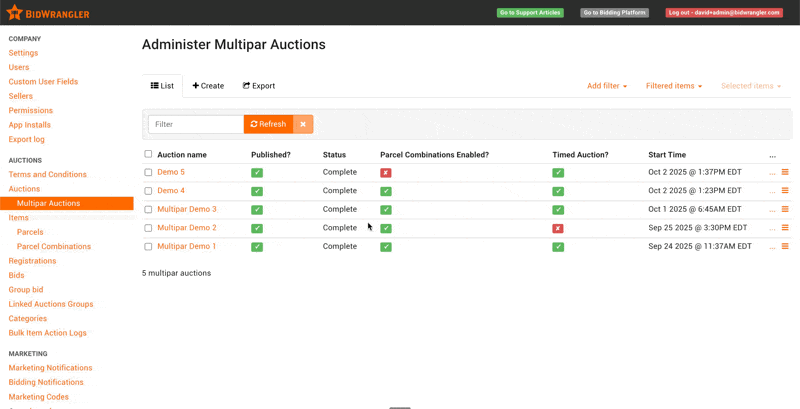This article will guide you through the setup and operation of a Multi-Par Auction in the BidWrangler Admin Portal. Before creating your first Multi-Par Auction in BidWrangler, this feature must be enabled for you. To do so, please email us at helpdesk@bidwrangler.com. Additionally, if you would prefer to learn via our free learning modules, please include that request in your email.