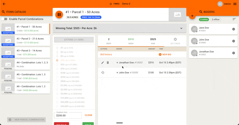 When all parcels or combinations haven't received bids within the auto-extend time, they will all sell or no-sale automatically based on the reserves and Winning Total.
