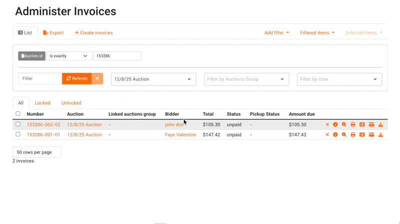 Item Release Tickets can be created in bulk or individually by filtering for an auction similar to invoices and pick lists, or individually via "Invoice Actions":
