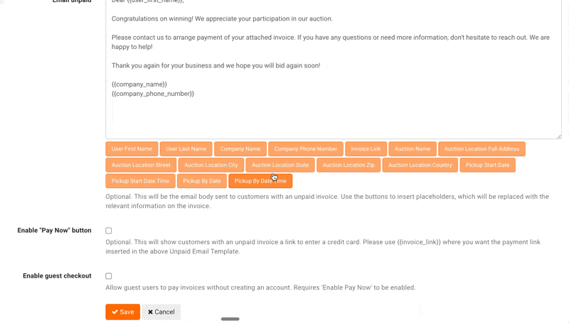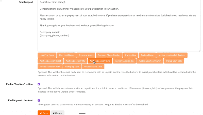 {{invoice_link}}, appear with double brackets (e.g., "{{user_first_name}}") and can be added quickly by clicking the orange-colored variable button after placing your cursor in the field.After configuring the settings, click Save.