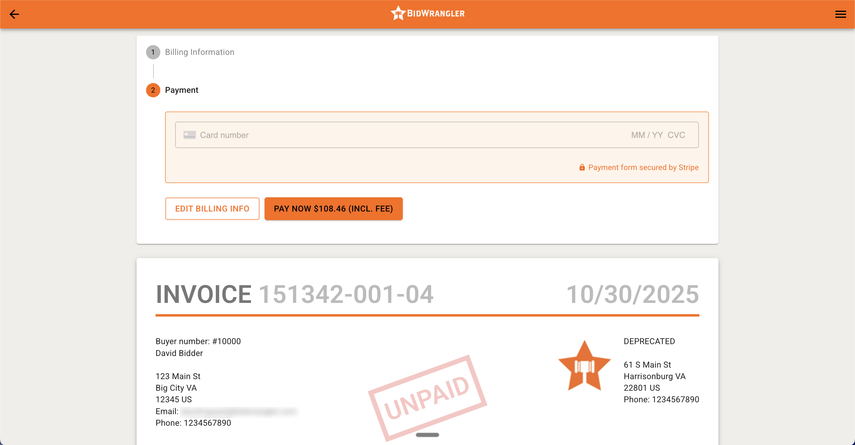 This article explains the "Guest Checkout" feature (also known as "Invoice Unclaimed Bidders" or "Enable guest checkout") within the BidWrangler Admin Portal, which streamlines the payment process for customers who have been invoiced, but have not yet created or claimed an account on your bidding platform. Even without an account, they may receive and access their invoice online, enter their card information, and then pay using the Pay Now feature.