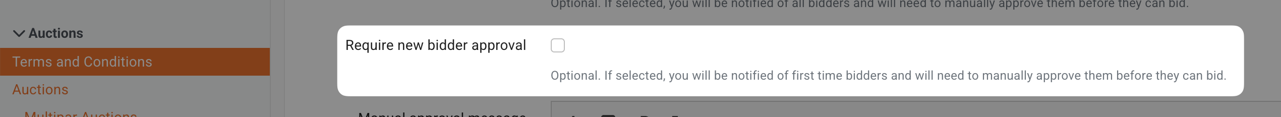 When enabled, first-time bidders must be manually approved before they are allowed to place bids. You’ll be notified when a new bidder registers, giving you the opportunity to review and approve them before bidding begins.